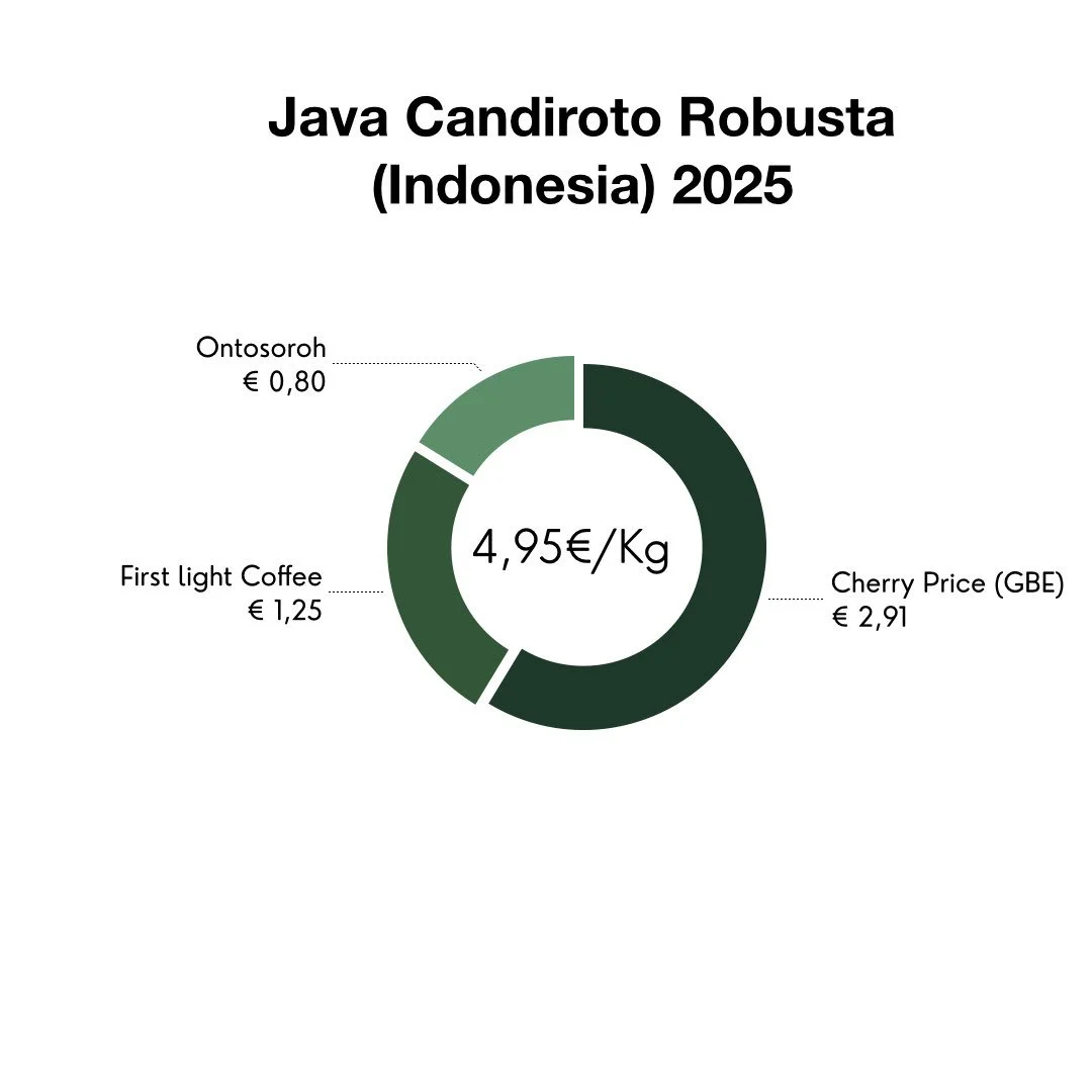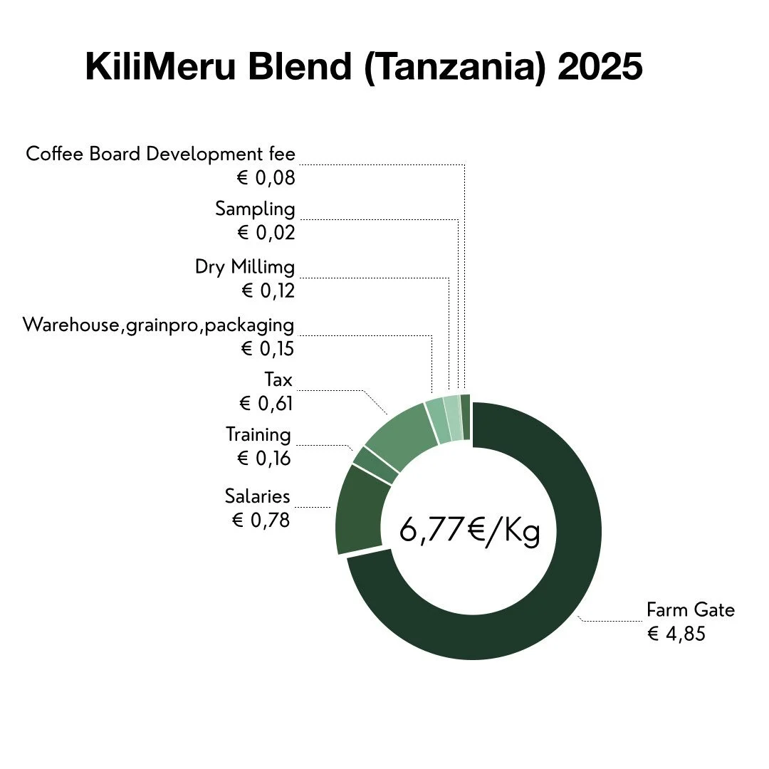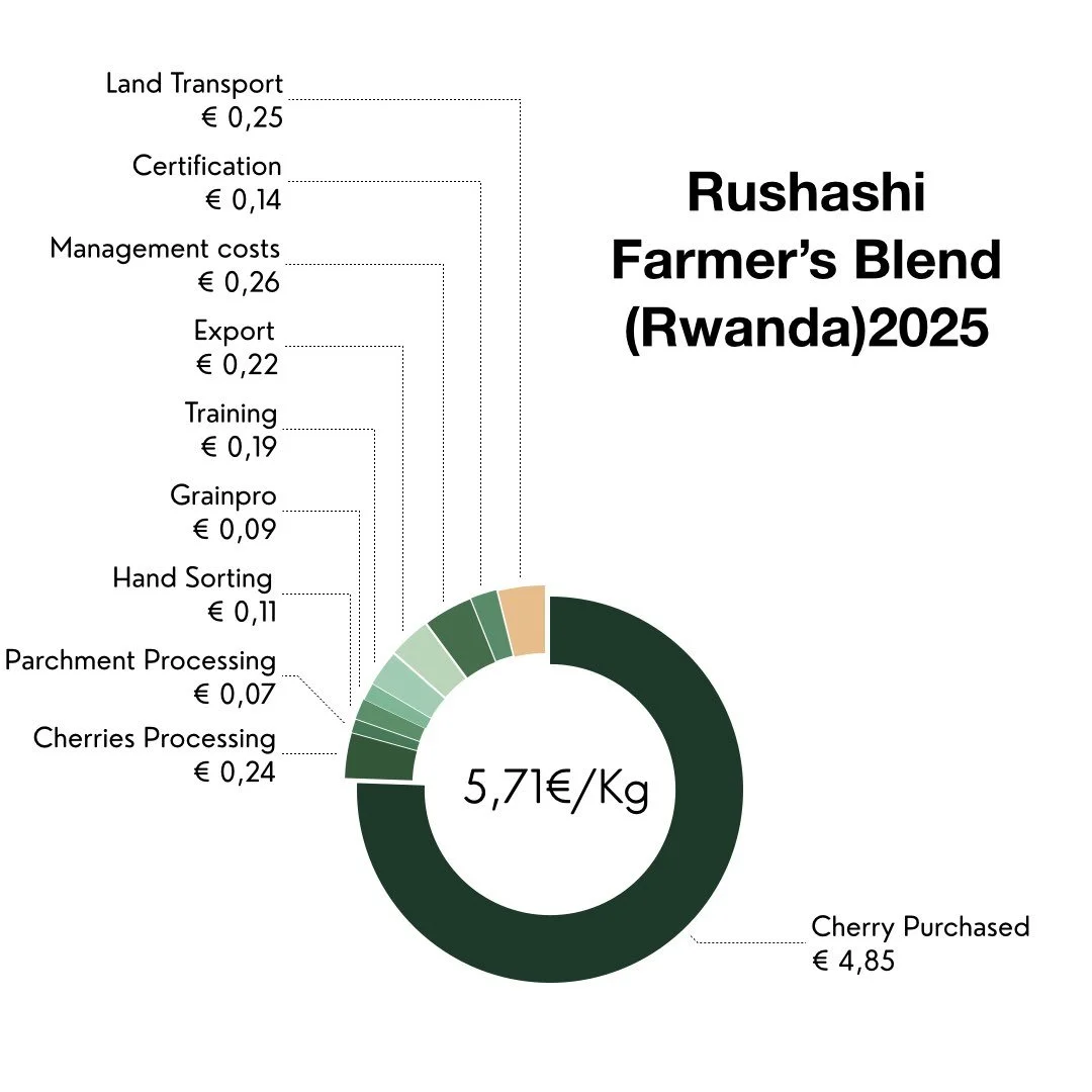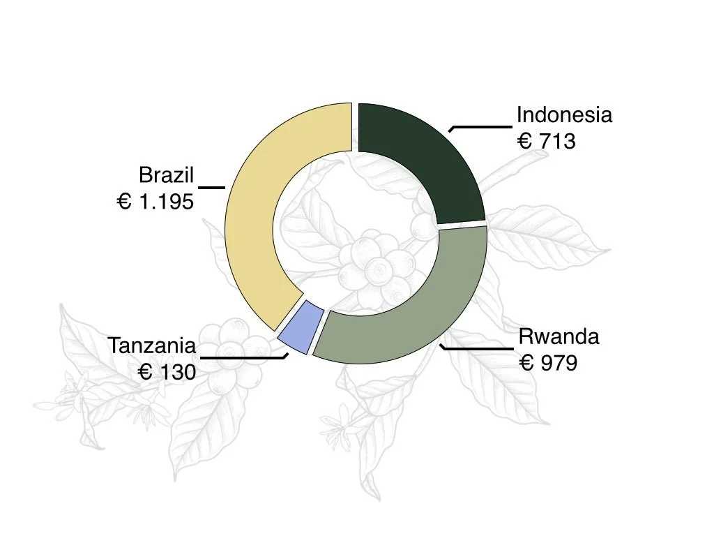 This figure represents the total kilos purchased from the partner multiplied by a fixed premium of €0.06, which we apply across all coffees. This premium is returned to our partners to initiate regenerative projects of their choice. It is important to us that they retain full autonomy over how these funds are used, offering a small but flexible addition to the value already built into the prices paid at origin.