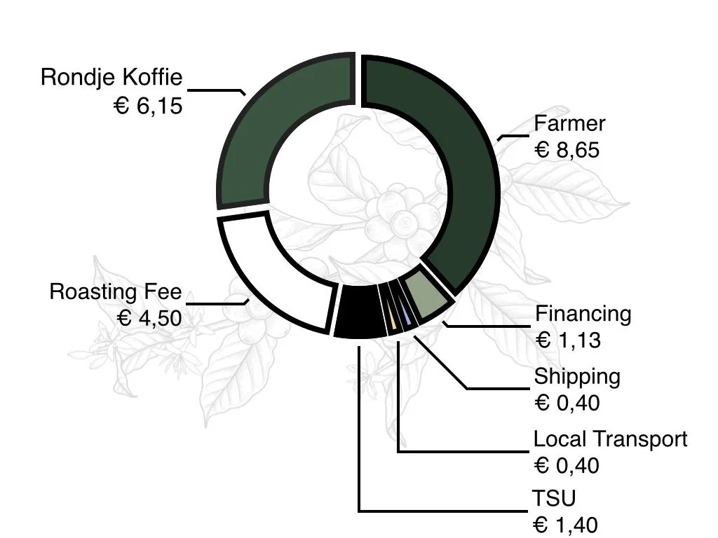 Betaalde prijs (in contract) van $ 2,40/lb voor de boerenblend van Finca Churupampa. Dit bedrag wordt rechtstreeks betaald aan de coöperatie, die een eigen exportvergunning heeft. Omgerekend naar kilogrammen is dit € 4,56 per kg.