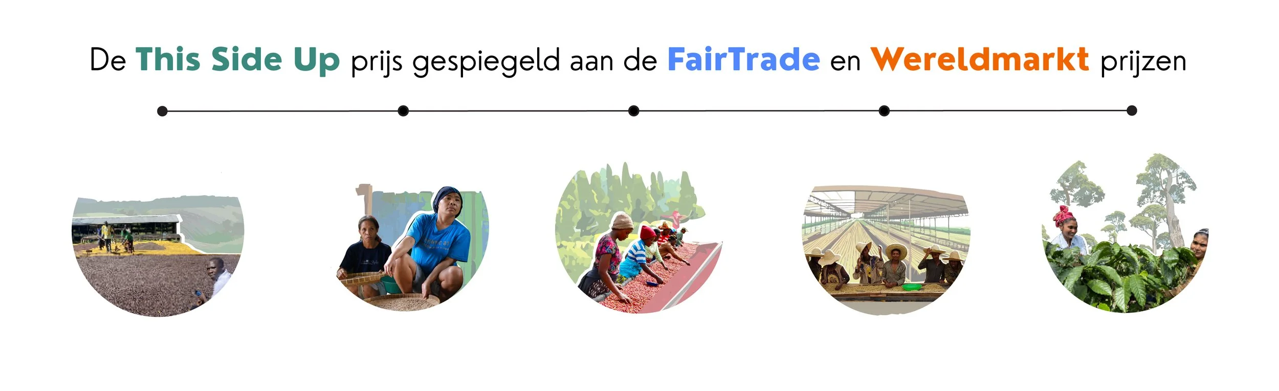 This Side Up werkt elk seizoen nauw samen met de oorsprongspartners om te bepalen wat een eerlijke prijs voor de koffie is, op basis van een aantal factoren, waaronder productiekosten, inflatie en de invloed van de wereldwijde koffieprijzen. Deze prijs varieert per land en wordt per koffie bijgewerkt in nauwe samenwerking met onze 13 productiegebieden.