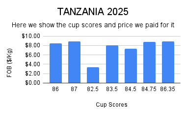 The Tanzanian portfolio is fairly straightforward regarding the quality vs price division. The higher scoring coffees are priced slighter more than the lower end specialty. We have started buying more grades beside A1 starting from 2025. It expands the possibilities for diversification and reduces the pressure on farmer to produce only high scoring lots.