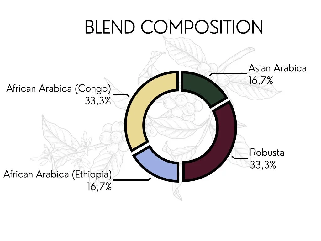 Ethiopia: Fully washed, with cherries hand-picked, pre-sorted, floated, pulped, wet-fermented for 12 hours, soaked, washed, dried on raised beds, and dry-milled under the supervision of the farm owner, Giday. Congo: Fully washed, involving 12 hours of wet fermentation, washing with mountain water, shade drying and pre-sorting, followed by sun-drying on raised beds. Indonesia: For Robusta : only the ripest red cherries are picked, submerged to remove floaters, pulped, and fermented in anaerobic tanks for 5 days — dry fermentation for Tugusari and submerged fermentation for BP — before open-air drying on raised beds for 15 days, one-month resting, hulling, and final sorting, while wet-hulled lots follow the traditional giling basah method of pulping, brief fermentation, partial drying, hulling at high moisture, and final drying. This combination makes the blend’s flavours pop by layering Ethiopia’s bright, delicate aromatics with Congo’s structured sweetness and Indonesia’s bold, creamy depth, creating a cup where clarity, body, and sweetness amplify each other rather than compete.